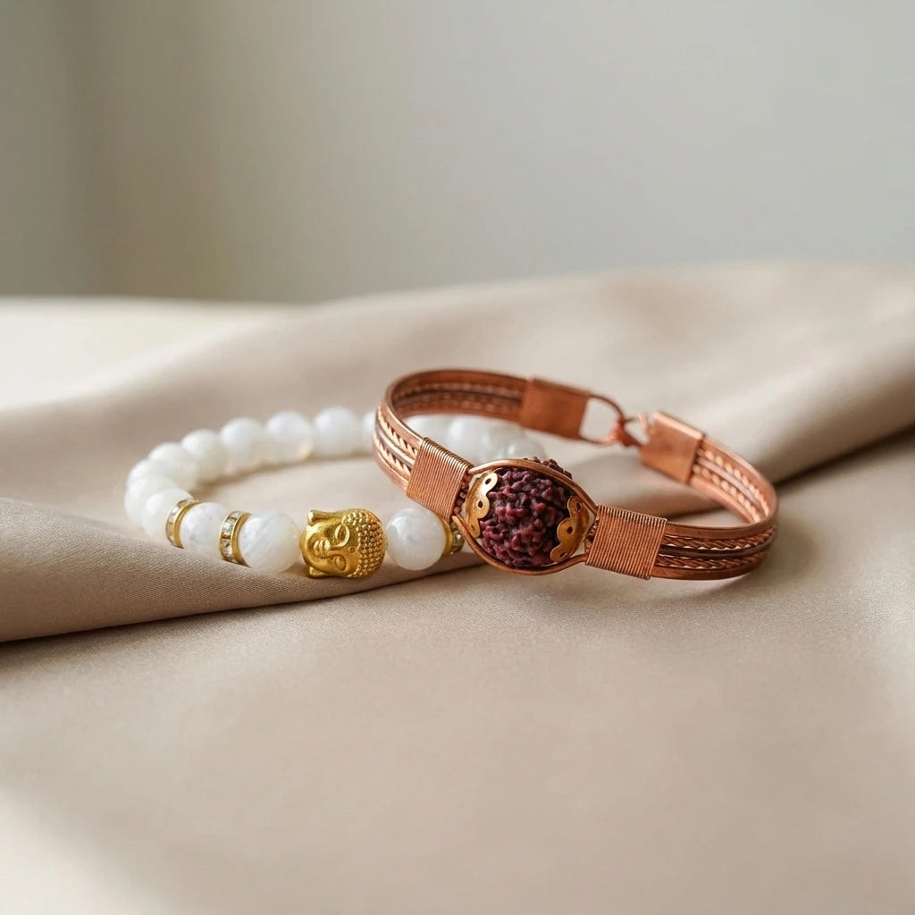 Get estimated delivery dateAlign your energies with the Shiv-Shakti Set, a divine pairing of fierce protection and soothing intuition. This combo unites the 5 Mukhi Rudraksha Copper Bracelet with the Moonstone Buddha Bracelet to create perfect spiritual equilibrium.