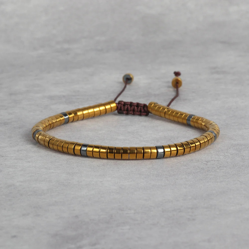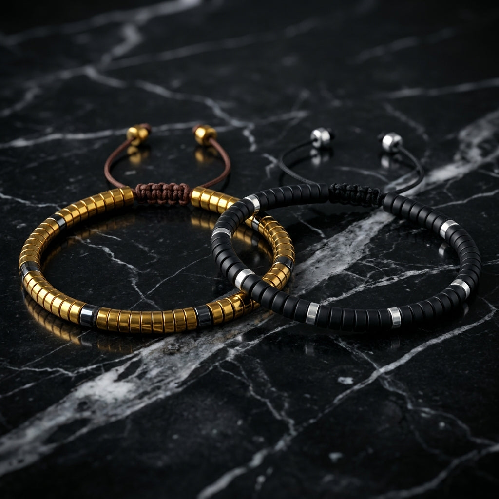 • Bracelet 1 (Him): High-shine Golden Hematite beads.