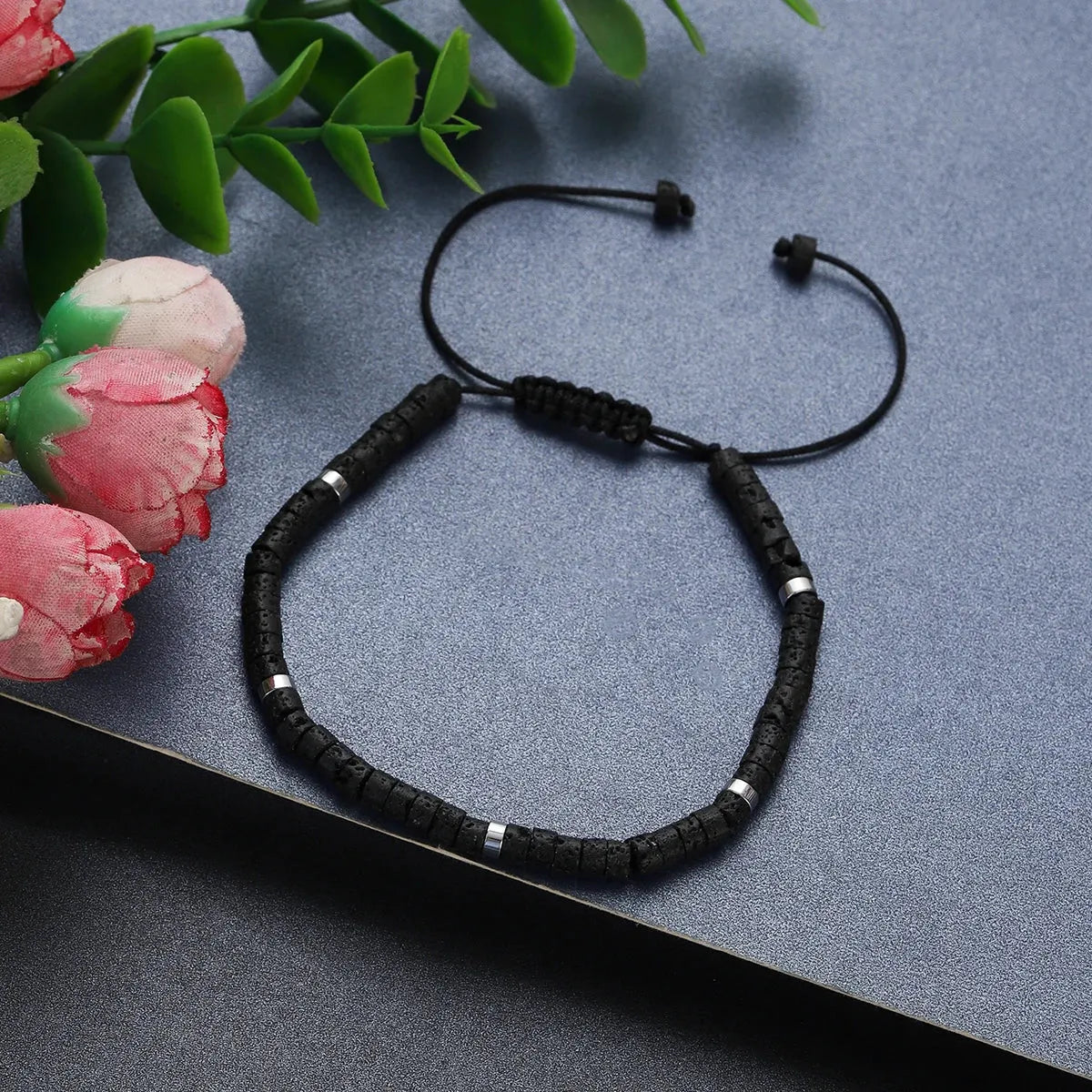 • Bracelet 1 (Him): Rugged Matte Black Lava Rock beads with porous texture.
