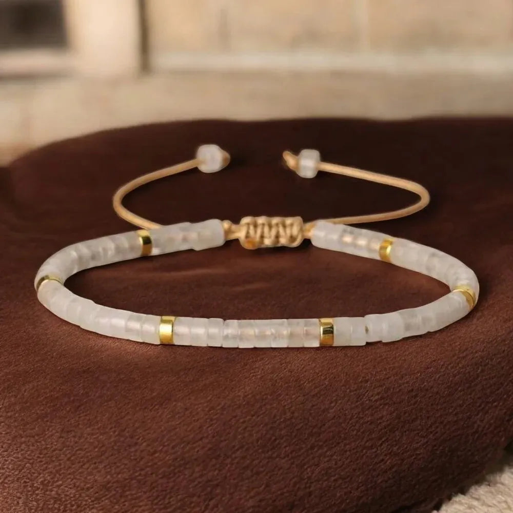 • Bracelet 2 (Hers/Sheetala): Translucent Clear Quartz beads with gold accents.