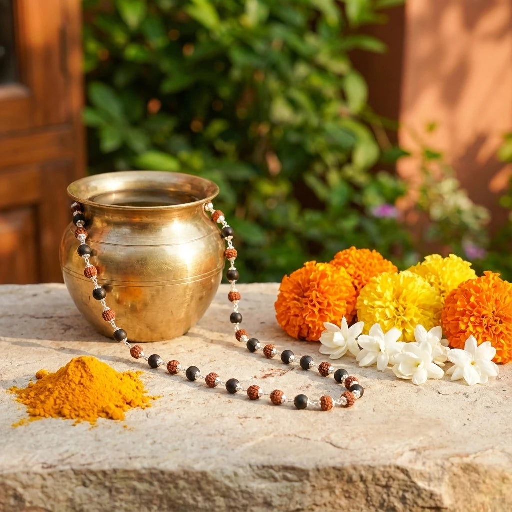 Get estimated delivery dateA sacred combination of powerful Karungali wood and original Rudraksha, beautifully finished with silver-plated caps. This malai offers divine energy, grounded protection, and spiritual focus – ideal for daily wear, temple visits, or spiritual practice.